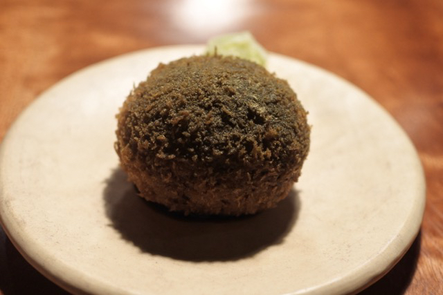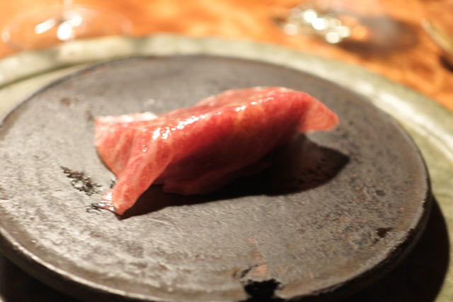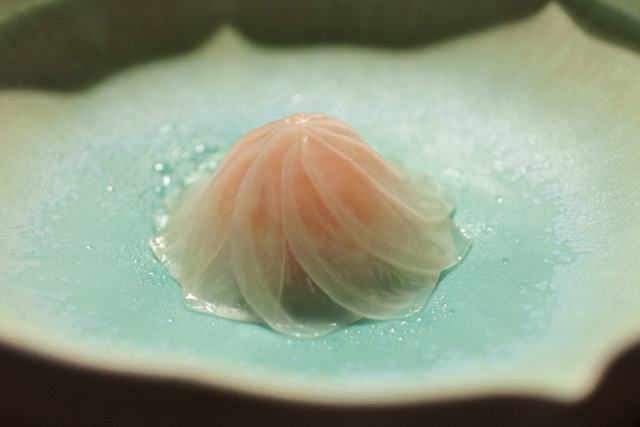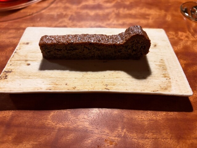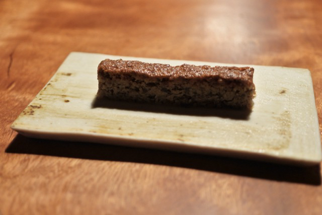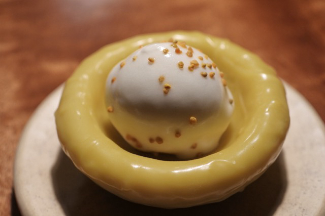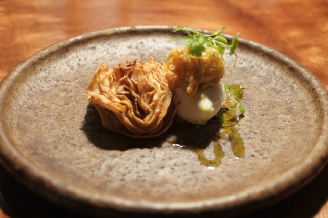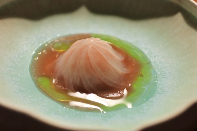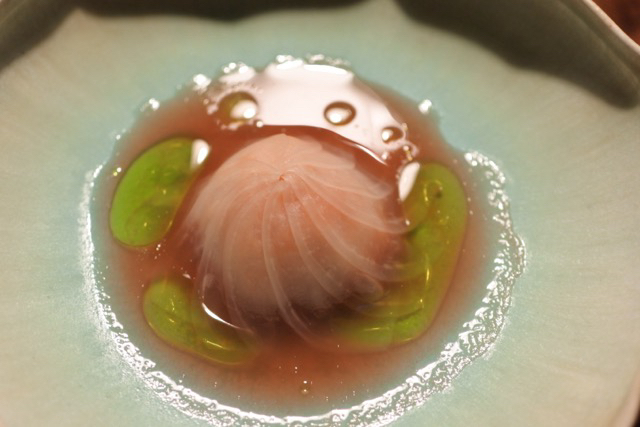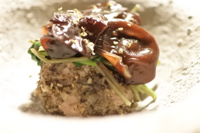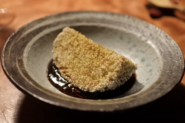 シーズン毎に色々な野菜を再構築させたお料理が出るのだが夏はズッキーニ。朝取れの丸いズッキーニを4頭分してお米のおかきを表面に惑わせ揚げたもの。ソースはズッキーニを300度のオーブンで焼き布で包み絞ったものを煮詰めたもの。この料理には塩や砂糖、醤油や味醂など調味料は全く使ってないのが驚き…。