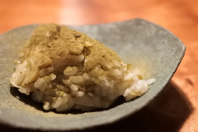 地元、佐久の五郎兵衛米を蒸してから発酵させた野沢菜と黒鮑をあえて上から半年発酵させパウダーにした野沢菜をふりかけたものを。お米の美味しさを味わってほしいから出汁とか鮑の肝とかは入れずに…