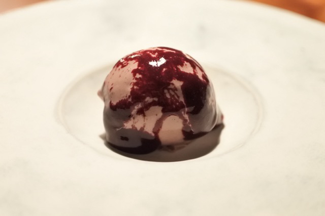 黒米を柔らかく炊いてから牛乳で煮た黒米のアイスクリーム。軽井沢の無農薬で作ったプルーベリーのソースにラベンダーを煮出した香を。下には黒米を揚げたものを…