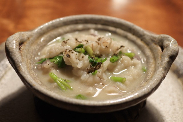 蒸したお米だから水っぽくならず発酵させた野沢菜のパウダーでお米のうまさと甘みが感じられ鮑の食感がアクセント。私的に大好きな野沢菜のパウダーw。やっぱ美味しい一品。