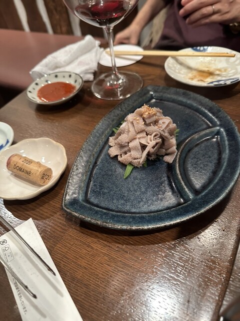 シャンパンの後に、ブルゴーニュの赤を飲みながら、特上の牛タンの刺身やセンマイの刺身などを頂きます。