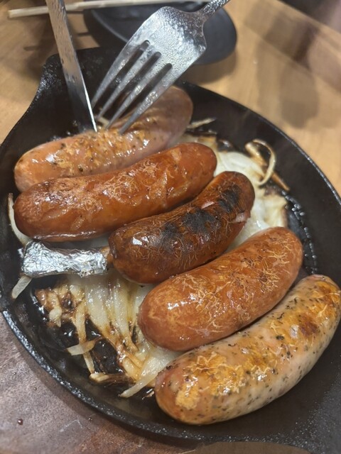 ちびちびと食べながら談話していると、次はおすすめメニューのソーセージが食べたい!というリクエスト。頼むと、ジュージューあつあつの鉄板に食べ応えありそうなソーセージがのっかって出てきました。気分はドイツだな、ということでまたビールに戻ります。チョリソーやブラックペッパーなど、パンチのきいたソーセージで、お腹いっぱいになっていたのに、一瞬で完食になりました。