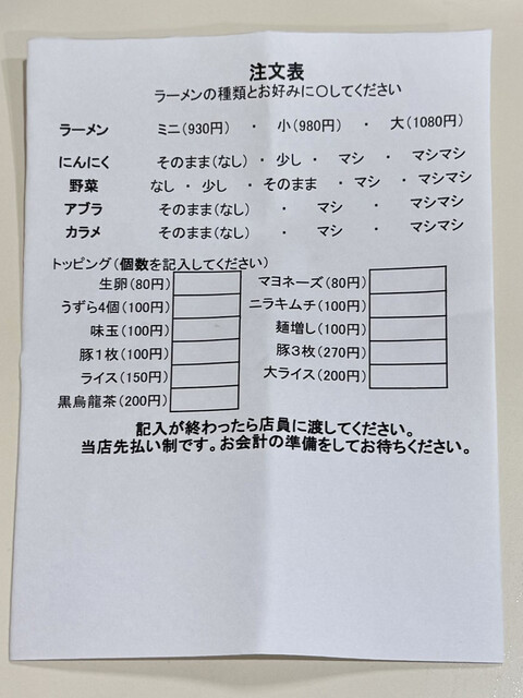 メニューはラーメン一種類しかなく、卓上に注文用紙があるのでそれを見て書けばわかる感じです。