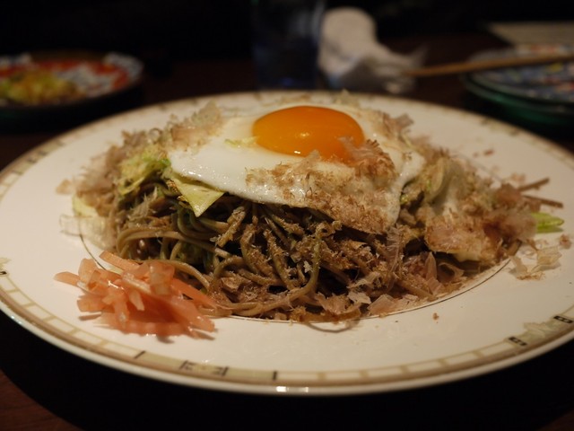 料理: まずは東京ではあまり食べれない浜松市周辺のB級グルメ遠州焼き(えんしゅうやき)。 たくあんのみじん切りが入ったお好み焼きです。 ソース味で食べるのもいいが、やはり醤油味で食べるのがベスト! メインはお好み焼きだが、サイドメニューもとても面白い。 肉巻きギョウザや牛スジ煮込みがお勧め。 餃子の皮の代わりに薄い肉を使っている。 和風そばは、おそばを使って焼きそばにした感じ。 お好み焼きは油を使わないのでパリパリ感は少ないが、味がとてもユニークでやみつきになる。