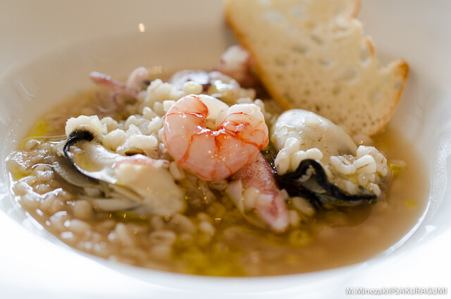 イカと牡蠣から出た少し塩気のあるスープの旨味を大麦が吸い込み、付け合わせのパンをスープに浸していただきました。赤えびの火の通り加減が絶妙(身の表面が輝いて見えます)。