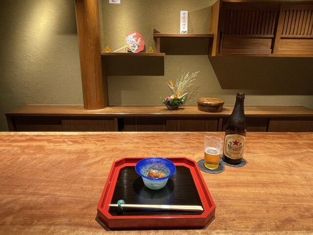 カウンターに腰を下ろすと、職人の所作が目に入る。無駄のない動きと、素材を扱う真摯な姿勢に、料理を待つ前から期待が高まる。