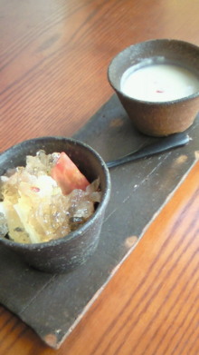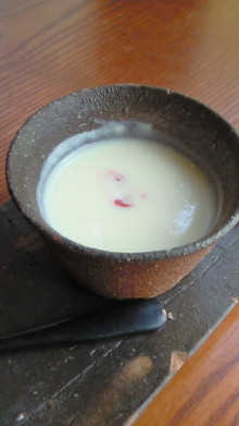 野菜料理はじゃがいものスープの梅肉ソースでこの組み合わせが斬新!ぼやけないしっかりした梅肉です