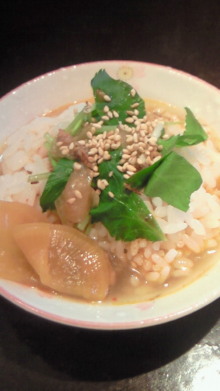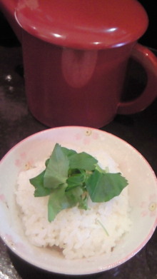 小さなご飯に三つ葉が添えられあつあつのスープ割とともにお茶漬けに~(*´ω`人´∀`*)
