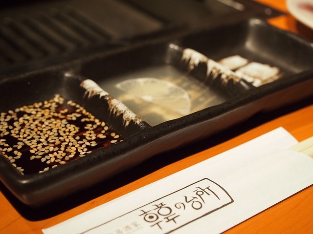 炭火で炙ったタン元はレモンを絞って。