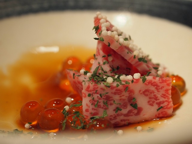 アミューズ(!)は軽く炙ったリブ芯とイクラをカシスベースの