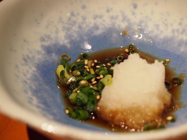 網にのせられたのは小鍋の鰹出汁。なんと!名物のタンしゃぶてすって!(感涙)たっぷりのおろしぽん酢で至福!
