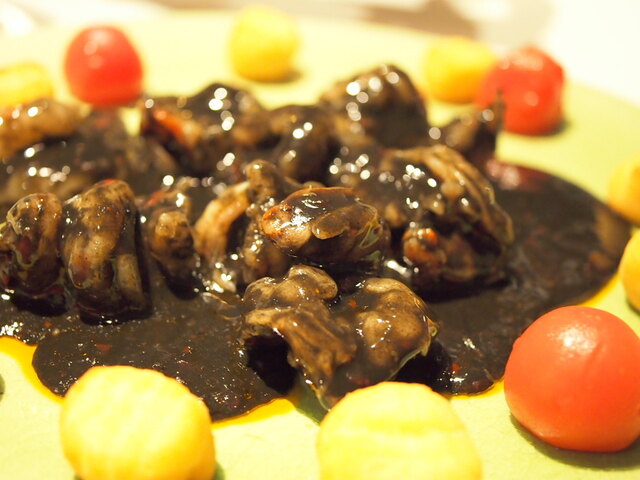 海老の黒チリソースイカスミと豆板醤のソース