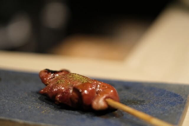 食前酒は十四代。酒器に使うお皿も素敵!笠間焼と九谷焼がお好きとおっしゃってたかな。特長がないのが特徴?主役はあくまでも焼鳥ですね。こちらで使用するのは世界で唯一の無菌鶏”高坂鶏”。絶妙な火入れ、旨味を引き出す技術に感服です。