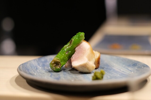 胸肉のたたきは柚子胡椒で。ふんわりとレアに焼き上げていますが、皮のパリッと感が際立ちます。先程の葱間とはまた違った美味しさ。しし唐と柚子胡椒の苦みが磯自慢に良く合いますね。ハツは生姜と共に歯触りと弾力を楽しんで。あおさ餡が滋味深い蒸しつくねの茶わん蒸しには百合根がごろり、計算された繊細な味わいに感服です。