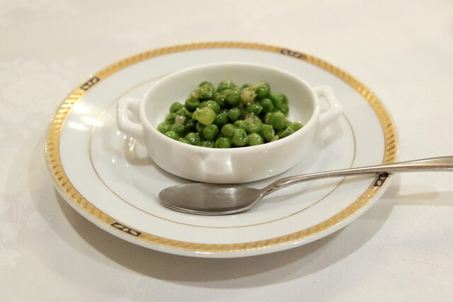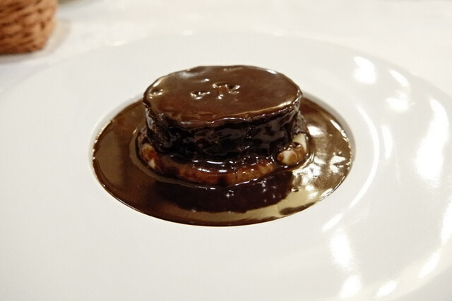 中にはフォアグラ、四つ足ジビエの中では軽い旨味のある肉と濃厚なソースに撃沈。パンとグリーンピースに付けて一滴残さずいただきました。絶品!
