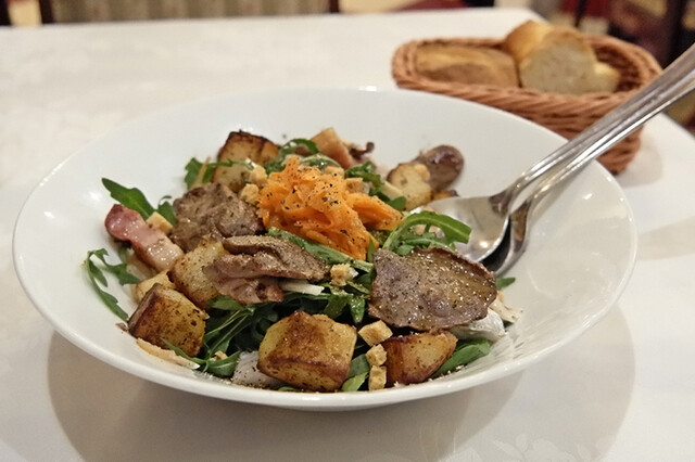 鶏のレバー、心臓、豚耳、ニシンのマリネ、ルッコラ、タンポポ、人参ラペなどが入ったリヨン名物の力がつきそうなサラダ。1人で食べるのは初めてで、けっこうなボリュームでしたが、あまり得意でないレバーなどもクセがないので、サクサク食べられます。
