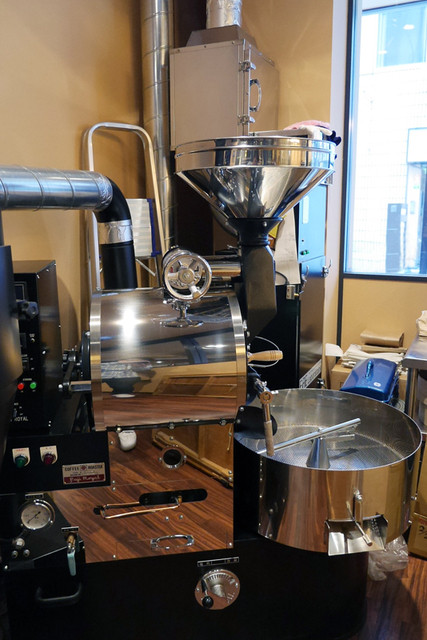 カウンター席の正面に沢山陳列された綺麗なカップ、業務用の巨大な焙煎機が目を引きますね。