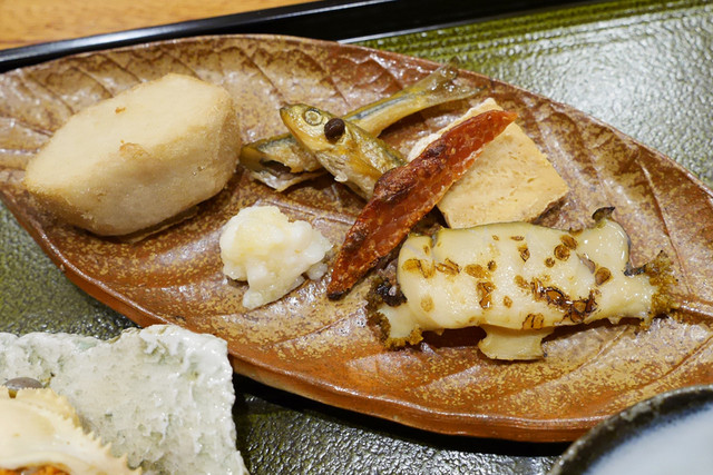海老芋、鮎の白子と卵の塩漬け、滋賀県産もろこ、明太子の炙り、蘇、アワビの炙り