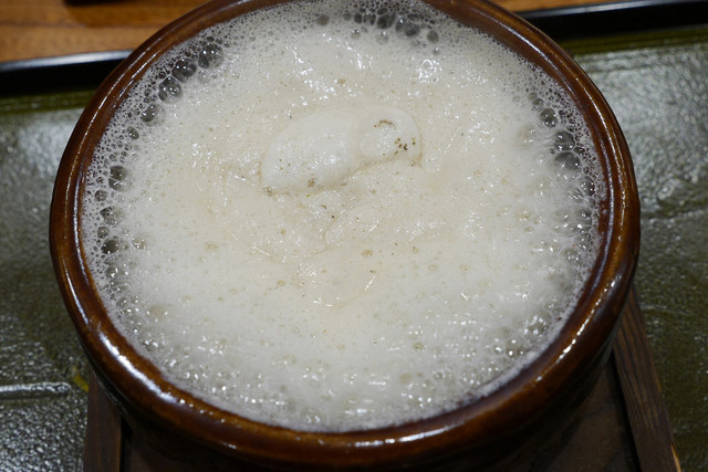 目の前のコンロで熱々に煮られた泡ブクブクのこちらも楽しいお料理。