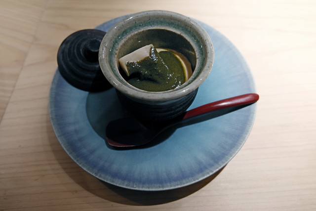 席に座り食べ始めるまでの緊張感、清浄な内装、料理とシェフの一言一言により広がる想像力、表象される素材の本質、戦慄、心の震え、そして後引く感動。伝統芸能で例えるなら能楽のよう。こちらが没頭するほどに素晴らしいものを見せてくれます。歌舞伎的な店は多いですが、能楽的な店は極希少、花は心、種は態、4人の才能が織りなす素晴らしい世界です。