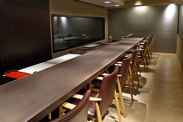 落ち着いた照明のシックな店内は直線のカウンター10席のみ。調理器具もほとんど置かれておらず、鮨店のように美しく洗練された印象です。