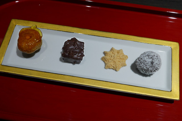 ・小菓子はカシューナッツのシュー、チョコ、メレンゲ、紹興酒のトリュフチョコ。