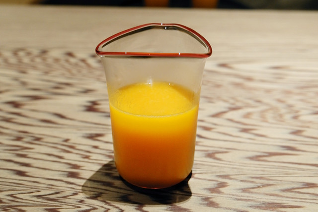 美術館に何気なく置いてあっても違和感無さそうな美しいお肉は山口県の高森和牛、ミートスペシャリスト沼本氏の必旨「沼本カット」。初めていただいたのですが、面白い!サーロイン2枚なのですが全く別物。1枚は肉の旨味を、もう1枚は脂身の甘み十分。基本的に脂は苦手なのですが、滑らかで下に絡む官能的ともいえる美味。スープは肉とカツオのごく明確な旨み出汁、京都産のクレソン、花山椒と全て主張のある素材を使った一品ですが、上品に、そして洗練を感じさせます。