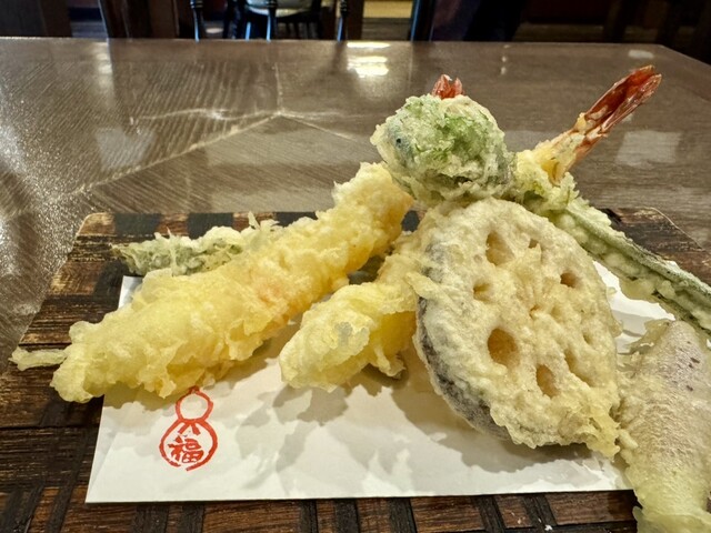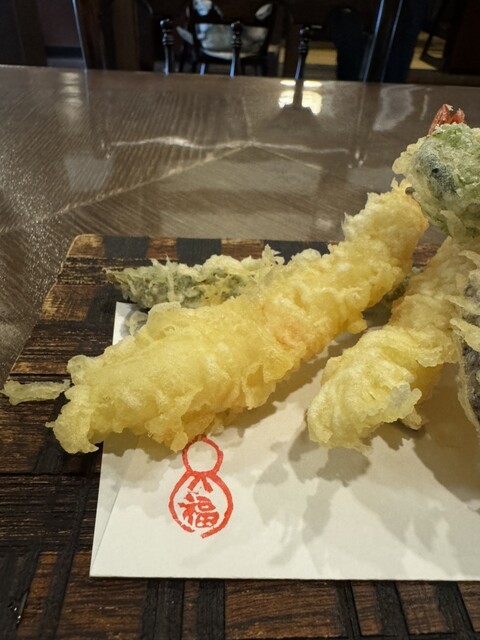 かなり大きめな海老2尾、アスパラや山菜の天ぷらが3品。