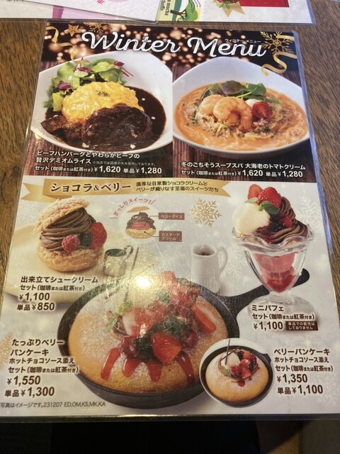 とりあえずホリデー限定らしい、オートミールパンケーキとアメリカン、連れはブリオッシュトーストにチーズがたっぷり乗ったトーストとブレンドに、追加料金のたっぷりサイズ。