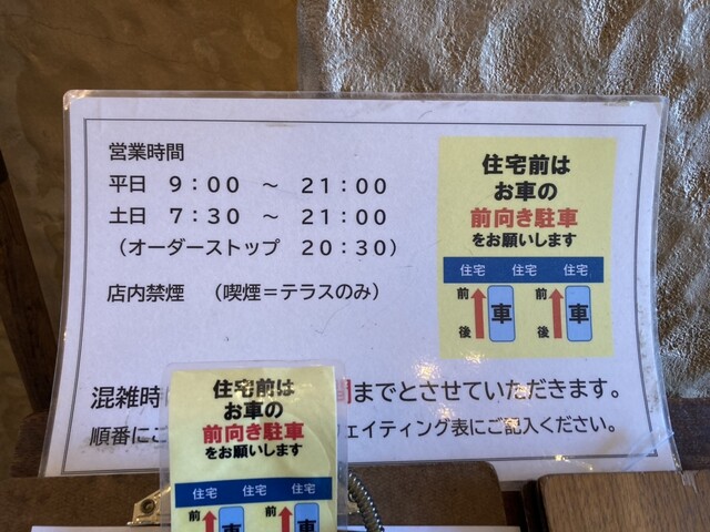 駐車場を前向きで止めるよう、かなり気を使われている模様。看板、入り口、オーダー待ちの記帳をすふ場所に表示及び声かけがほぼ徹底されています。