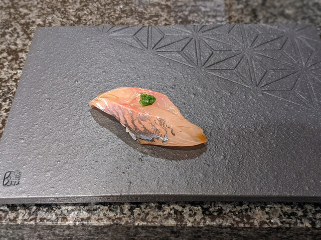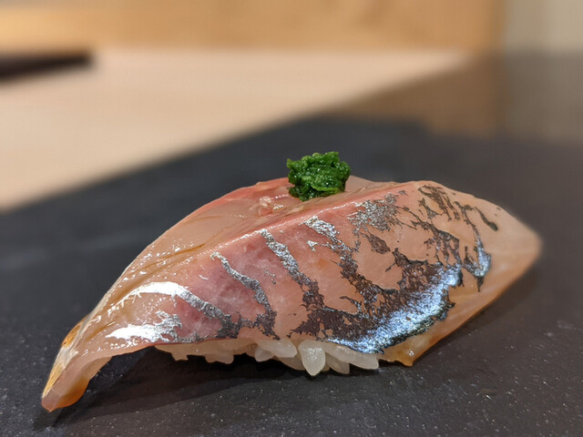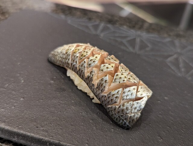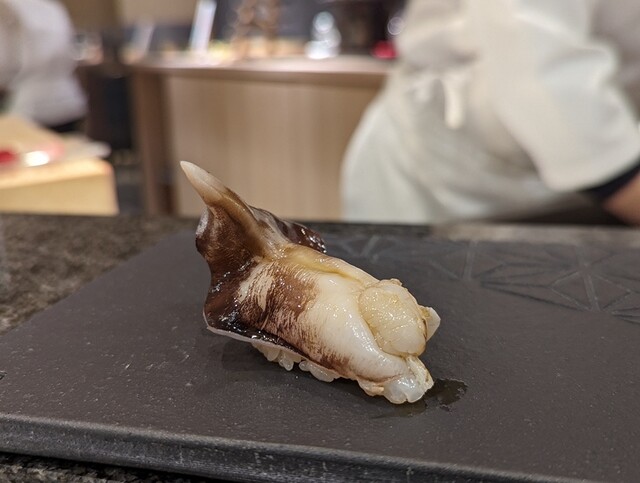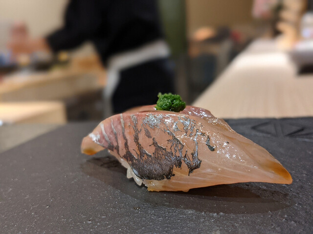 隠し包丁の美しさに目を奪われ、舌の上に置いたときの食感と味でこの隠し包丁の意味を知る、感動した握り。
