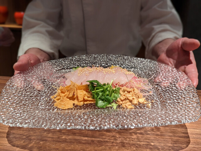 鳳成魚滑沙律:白身魚刺身のサラダを広東風オリジナル醤油ドレッシングと麻仁オイルで和えた一品。