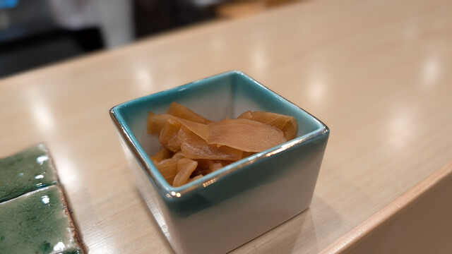 「河豚の七味焼き」のピリッとしたアクセントを挟みつつ、赤酢の効いたガリで口をさっぱりとリセット。