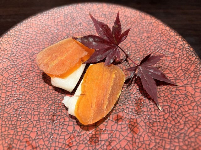 自家製カラスミは焼いた小さーいお餅と一緒に。(白いからお決まりの大根かと思ったらびっくり)
