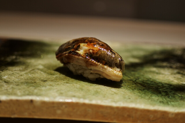 千葉県勝浦産、塩締めして皮目を炙っているので香ばしい皮目と旨味がギュッと詰まった身がシャリの甘さを引き立てます。