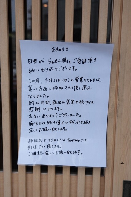 3月23日(日)の営業をもって寒川方面に移転する鴇。藤沢随一の名店が……。とても残念ですが、移転先にもまた行きたいし応援しています。
