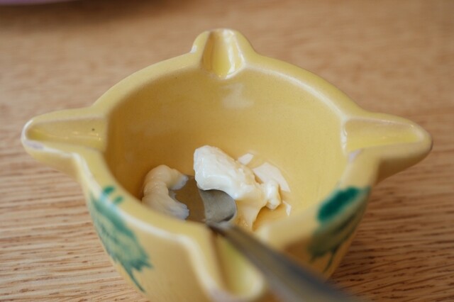 特製のマヨネーズをパエリアにつけて食べる