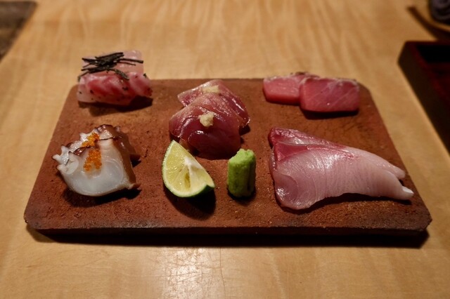 ②お造り盛り合わせ。どれをとっても美味しくて悶絶してしまう。特に昆布締めが好みでした。