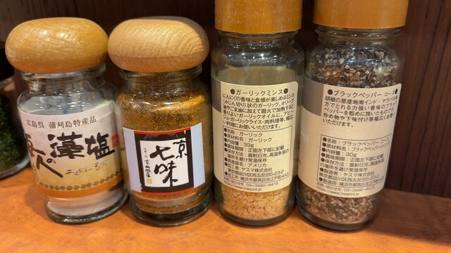卓上の置いてある青海苔、藻塩、七味、胡椒、ニンニクはどれも選別された良品で香味が優れている