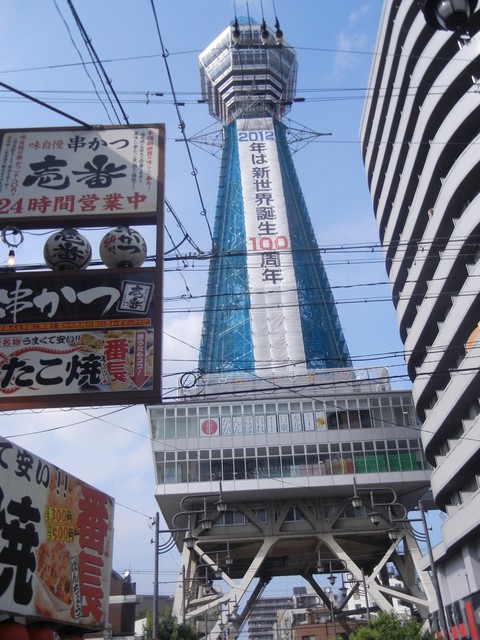 店の前から見上げる通天閣。ネオン、LEDに交換中。