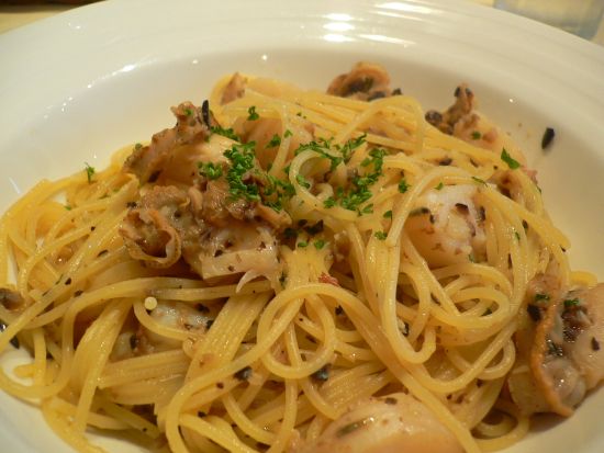 今日頼んだのはパスタランチ(1000円)の「きのことエビとアサリとホタテのオイルパスタ」