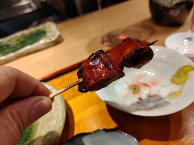 ●産卵前のメス鶏白レバー刺し。濃厚だが、フォアグラのような脂っぽさがなくめちゃ旨。もう一枚食べたかった。