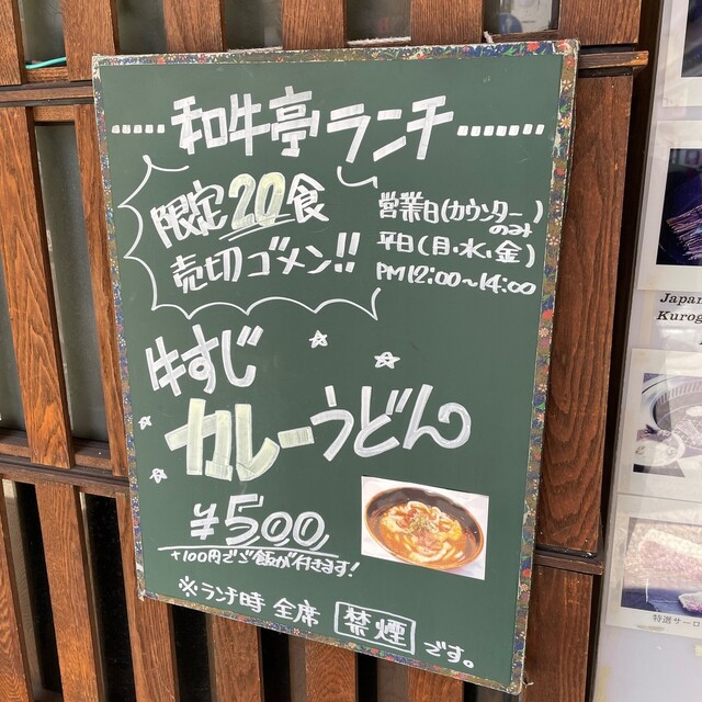 映画を期待して観に行くと感動が薄れるってよくあります。外食でも、張り切って行ってみたら肩透かしだったなんてよくある。けど、そんな心配全く無用のランチ登場。庶民のミカタなカレーうどんだけど、高級感があって一心不乱に食せる限定20食の品。一択のカレーうどんはナント500円のワンコイン。月水金だけなので、レア感あります。鰹出汁ベースの極めたとろみが食欲そそるスープに、甘辛く煮込まれた松阪牛の牛すじ肉と名コンビ牛蒡がトッピングされてます。もちろん油揚げも入ってる。牛すじというから硬めを想像してたけど、否々とっても柔らかいし牛蒡も柔らかだ~。仄かな甘みがカレーの辛味を増してうどんの喉越しを一層盛り上げてくれますよ。松阪和牛亭