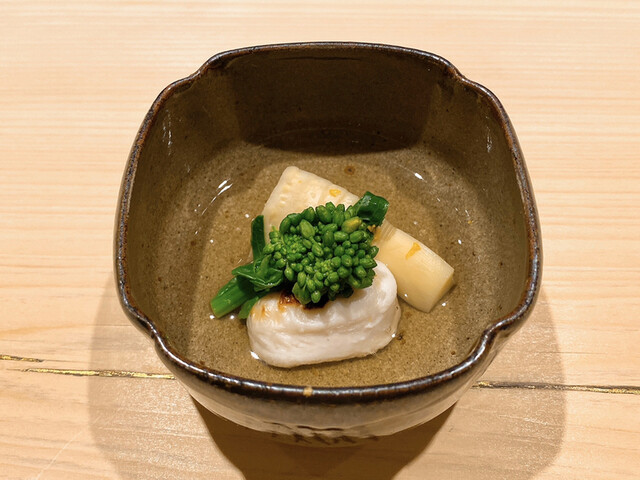 シャコとスナップえんどう、グリーンアスパラ、柚子のジュレと広島のじゅんさい