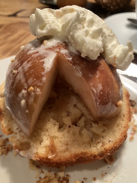 クルミドクリームケーキは、リンゴ1/2個をサンド。甘さと酸味のあるリンゴがとても美味しい。ケーキ生地はほんのり温かく、木の実のコクがあって…美味。”焼き立て感”がないのが…ちょっと寂しいところ。クリームはたっぷりでヨーグルトのようなさっぱり酸味感あり。ちりばめられた胡桃もいいアクセントで、買って帰れない…ここでしか味わえない点がいい。