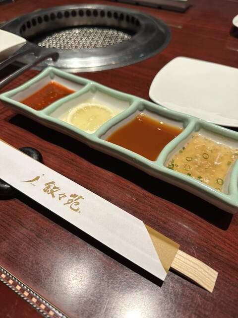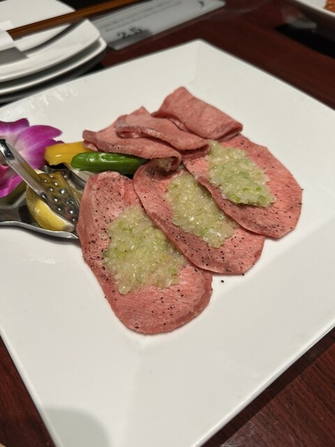 2人で上ネギタン塩焼、上ロース薄切焼、特選カルビ焼、キムチ、野菜スープ、冷麺、ライスをオーダー。