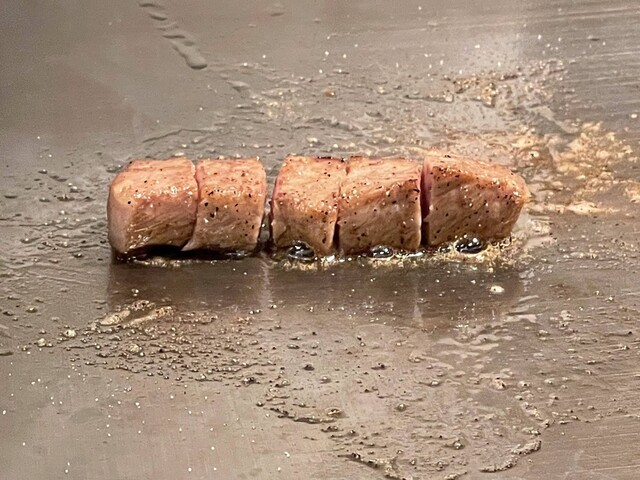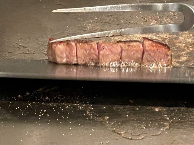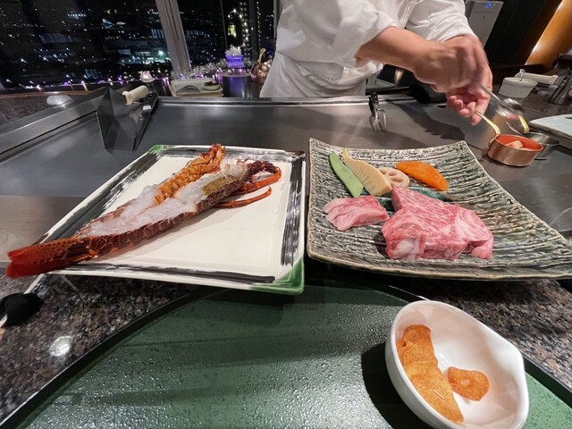 鉄板の後ろにはホテル最上階の夜景が瞬き華麗な手さばきでの調理、音、匂い、全てがライブであり、それを食して感動を味わうという幸せな時間️