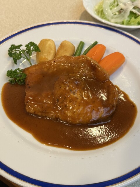 ポークチャップとライス、ミニサラダそれにポタージュスープをオーダー。