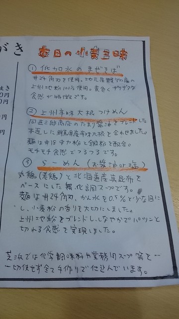 内容説明書きがないので、店員さんに聞くとメニューの脇に書いてある本日の小麦三昧という欄の3つのラーメンが出てくるというので、そちらをお願いしました。