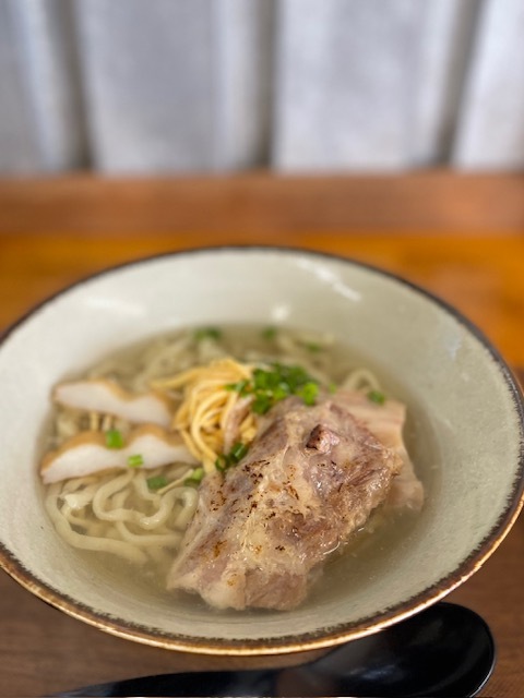 縮れ麺にスープの絶妙の塩加減と旨味がまとわりつき、モチモチ食感と相まって幸せが広がる。